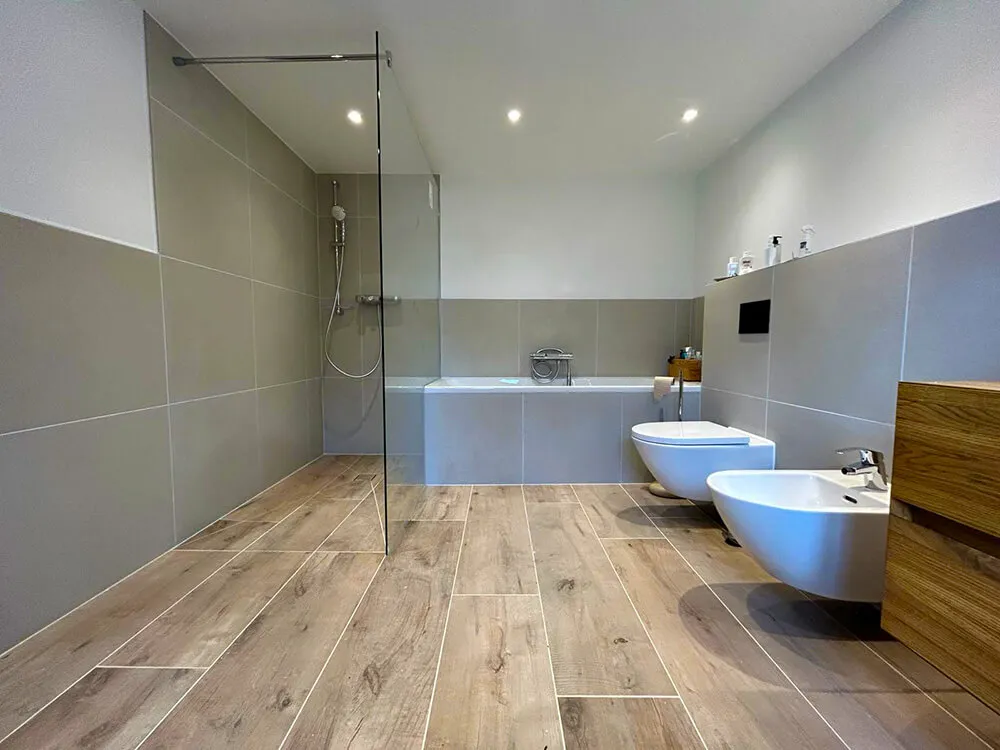 Langlebiger Baustil: Auf Wunsch verwenden wir besonders fleckenresistente Fliesen, damit Ihr Bad auch nach Jahrzehnten wie neu aussieht.